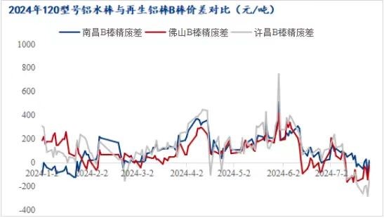 隨著鋁價的大幅回落,鋁水棒加工費也逐步回歸至往年中高位置。而再生鋁棒受廢鋁原材料高企制約,加上鋁價持續(xù)回落,企業(yè)長期處于虧損狀態(tài),再生鋁棒價格相比鋁水棒價格表現(xiàn)更加堅挺。就B棒而言,目前周均結(jié)算加工費在200-400/噸,點價結(jié)算加工費在350-550/噸,價格已趕超原生棒價格。7月份B棒精廢差在-300~100/噸區(qū)間震蕩盤整,且長期處于負值,精廢差倒掛。在高生產(chǎn)成本下,企業(yè)不得不集體挺價保利接單,下游對目前價格接受度有限,多采購原生棒居多,再生鋁棒市場需求遇冷。