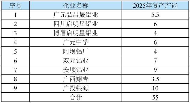 表1-2 2025年中國電解鋁復(fù)產(chǎn)產(chǎn)能變動(dòng)情況(萬噸/年)