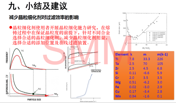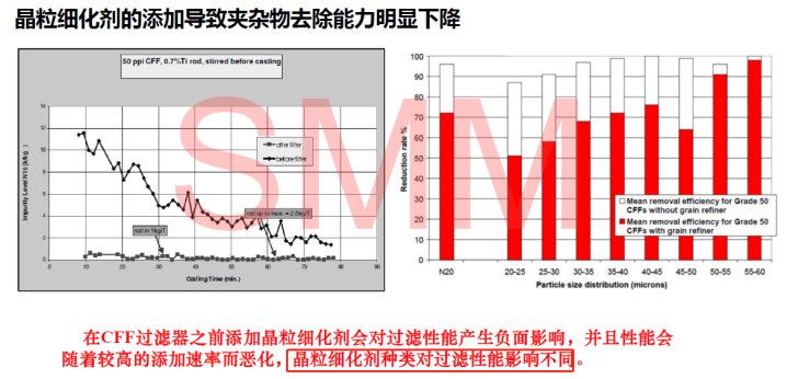 據(jù)丁總調(diào)查顯示,常用細化劑會對CFF過濾器的過濾性能產(chǎn)生負面影響,并隨較高的添加速率而惡化,并顯示晶粒細化劑種類對過濾性能影響不同。據(jù)業(yè)內(nèi)相關試驗調(diào)查,鋁鈦碳或因無TiB2,從而減少對CFF過濾器的吸附、堵塞,會大大降低細化劑對過濾器性能的影響。